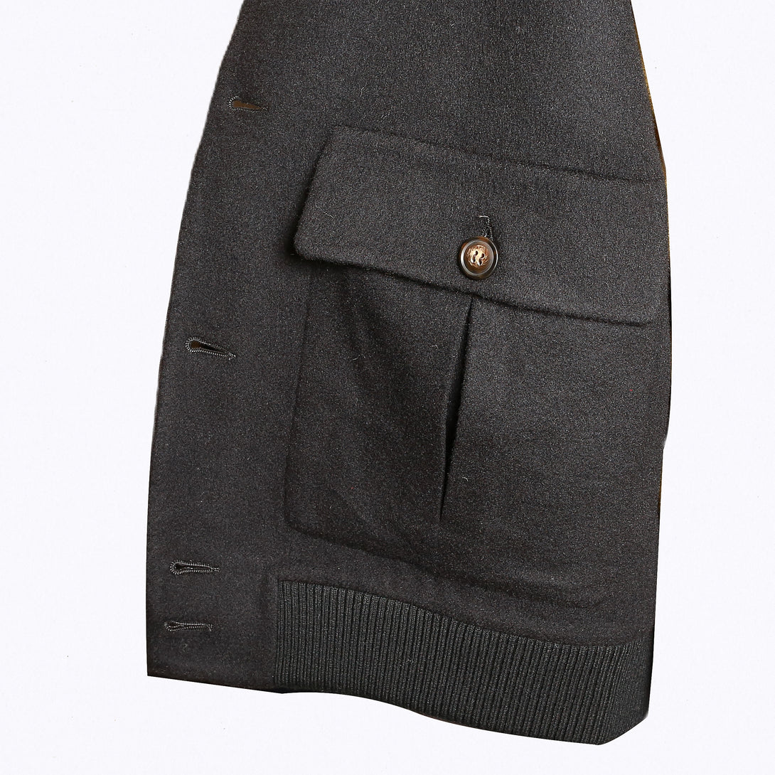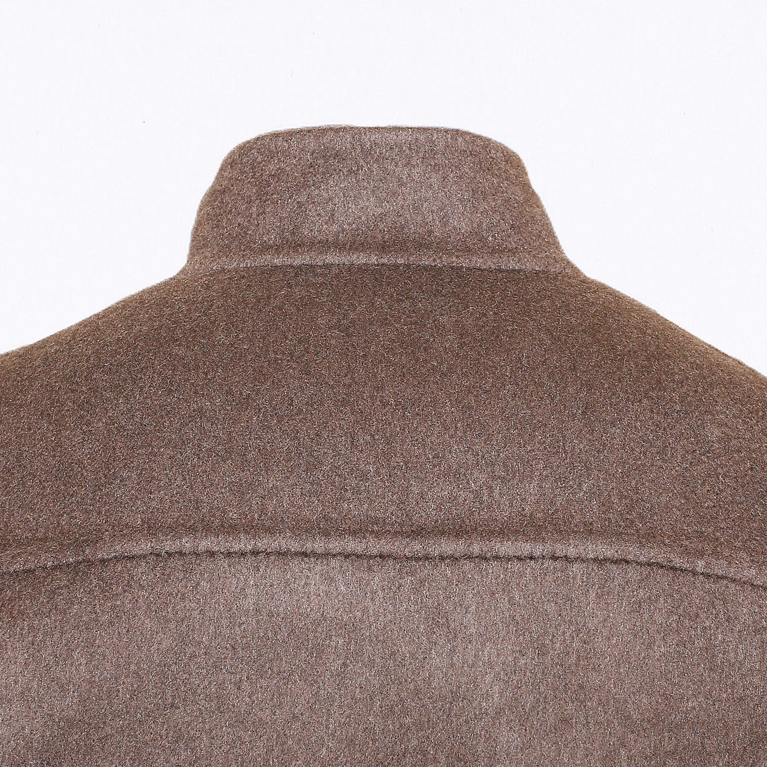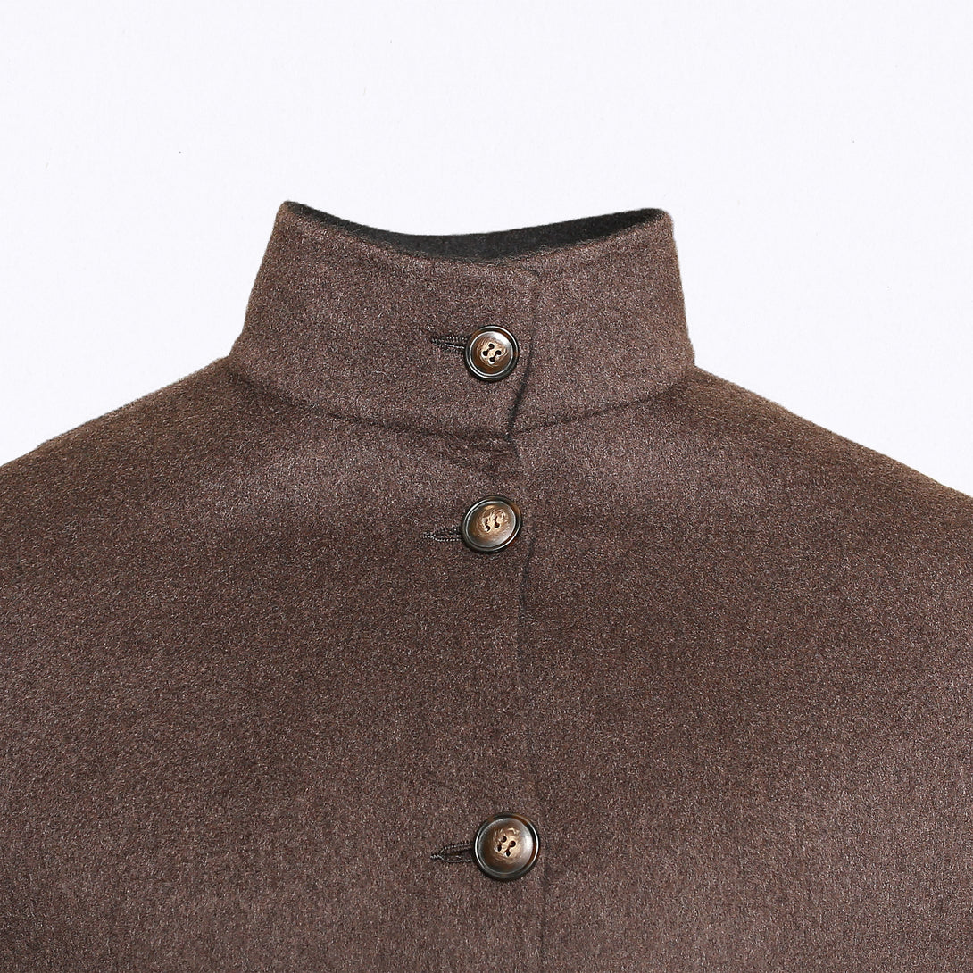 Crafted from a luxurious blend of alpaca and cashmere, this double-sided jacket offers two elegant looks in one. One side features a rich taupe-brown tone with clean button detailing, while the reverse side presents a deeper, charcoal-brown shade with flap pockets — giving you the freedom to switch between a refined minimalist silhouette and a more structured, utilitarian edge.